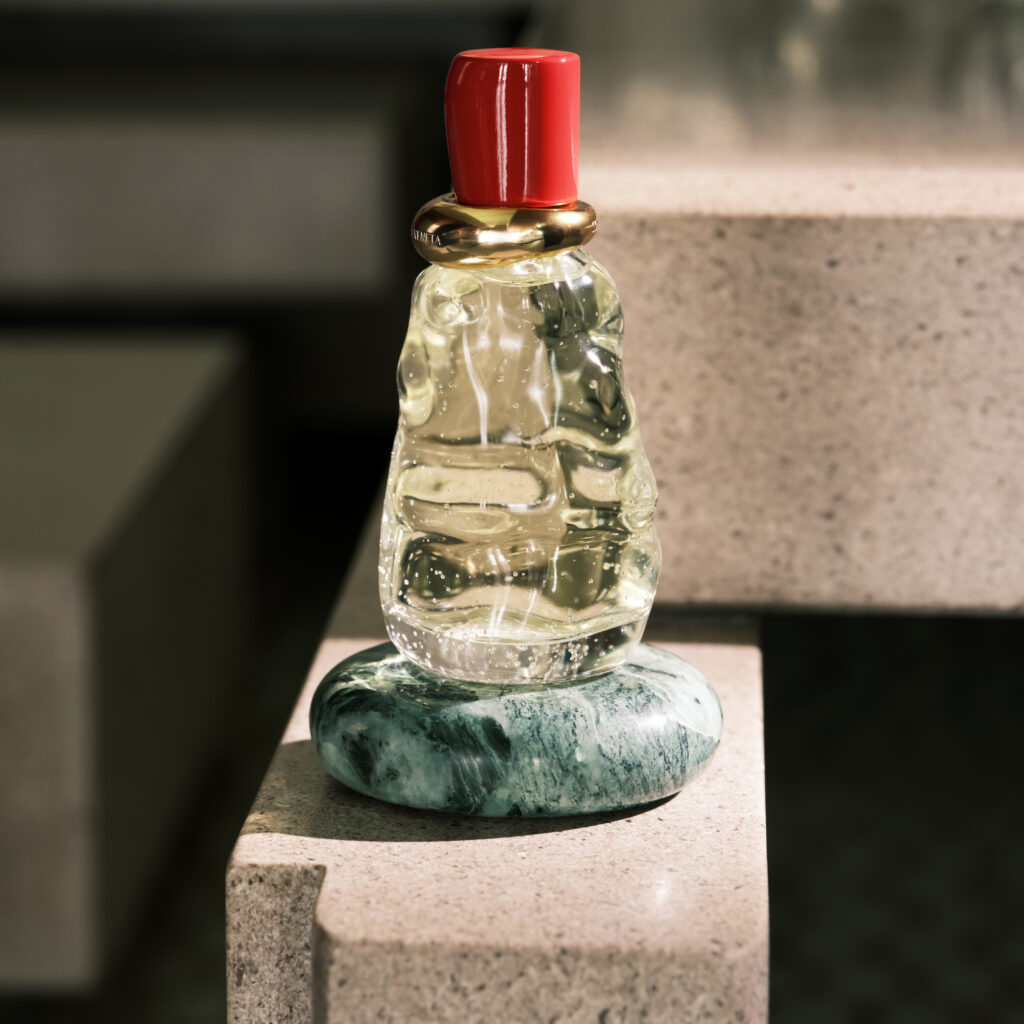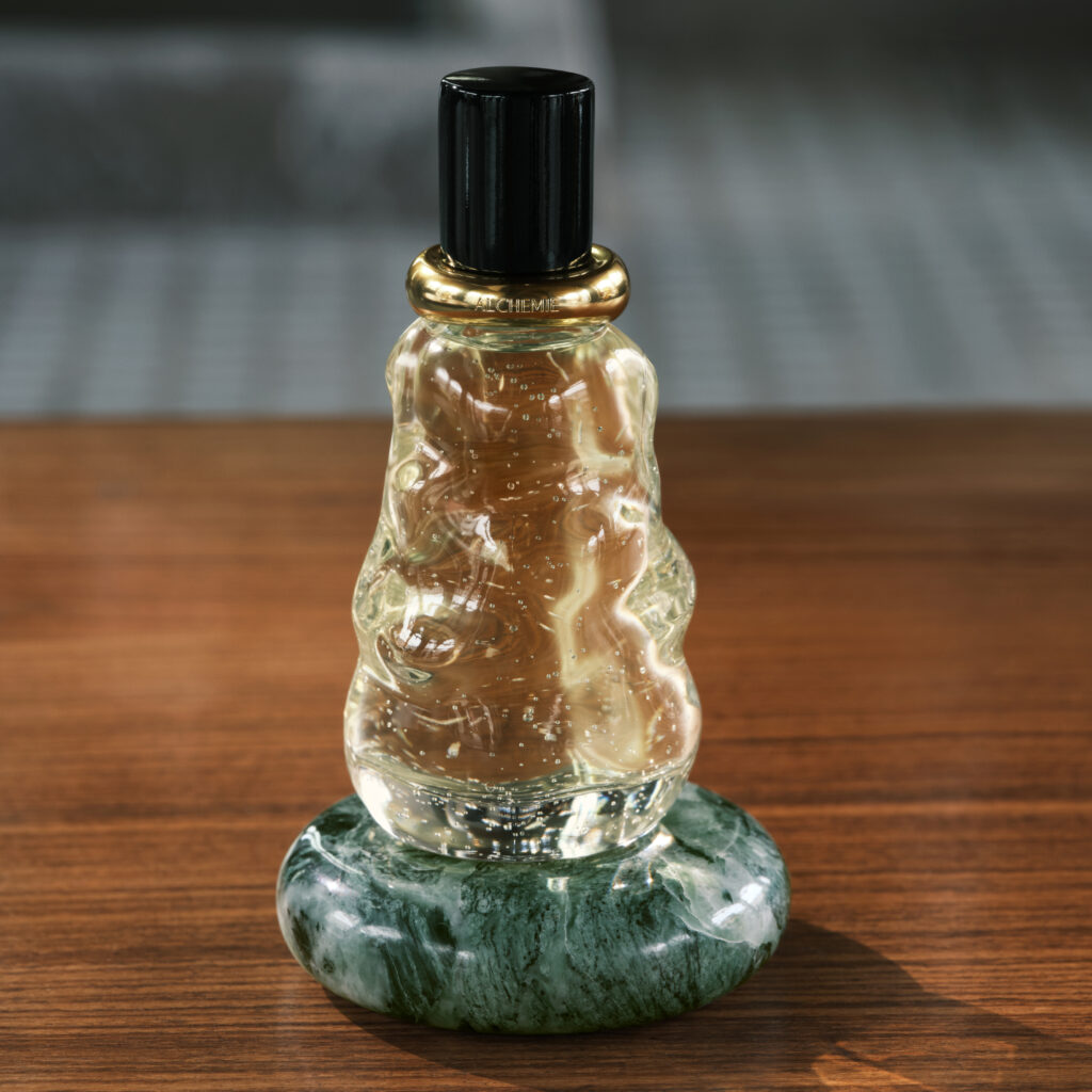 La colección se presenta en frascos de vidrio orgánico inspirados en la tradición del soplado de cristal de Murano. Cada fragancia cuenta con una tapa de madera teñida y descansa sobre una base de mármol negro Marquina, evocando la elegancia atemporal de la arquitectura veneciana.