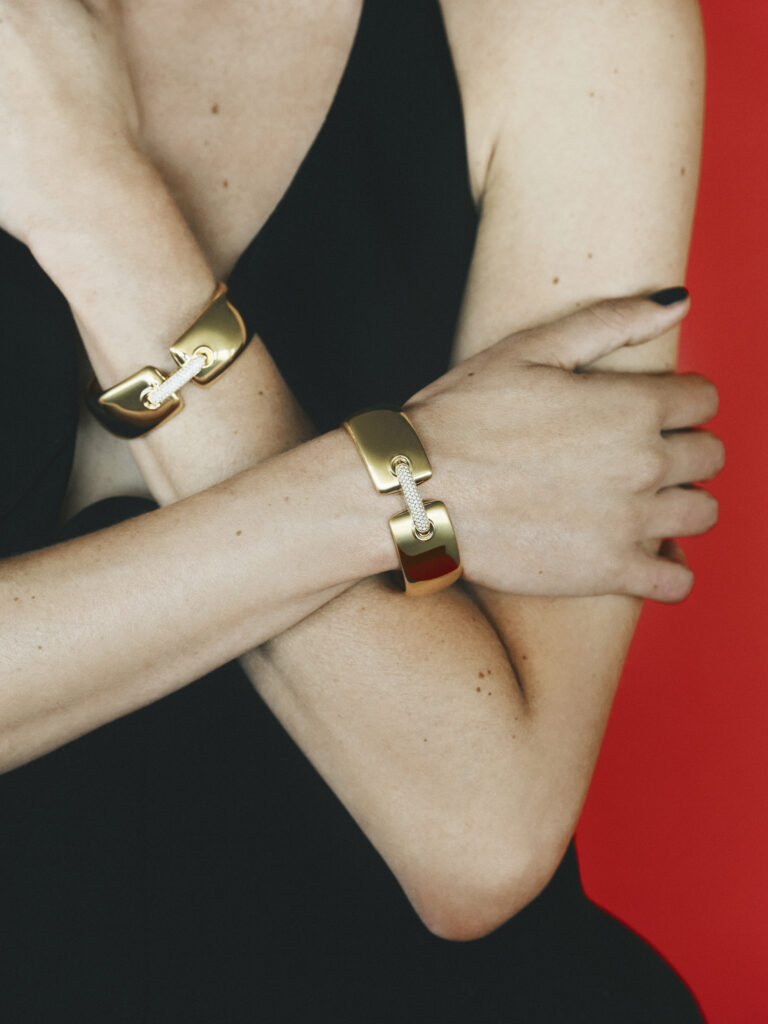 Las piezas, elaboradas en plata 925 con baños bicolor en oro de 18K o rodio, destacan por su carácter escultórico y su diseño entrelazado, reinterpretando el trenzado del corset con un toque moderno y atrevido. Algunas incorporan pavé de topacios blancos que realzan su brillo y volumen, reflejando la esencia audaz y sofisticada de la Maison.