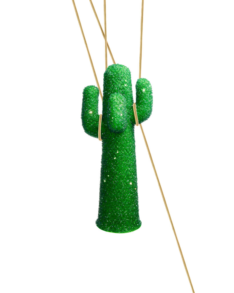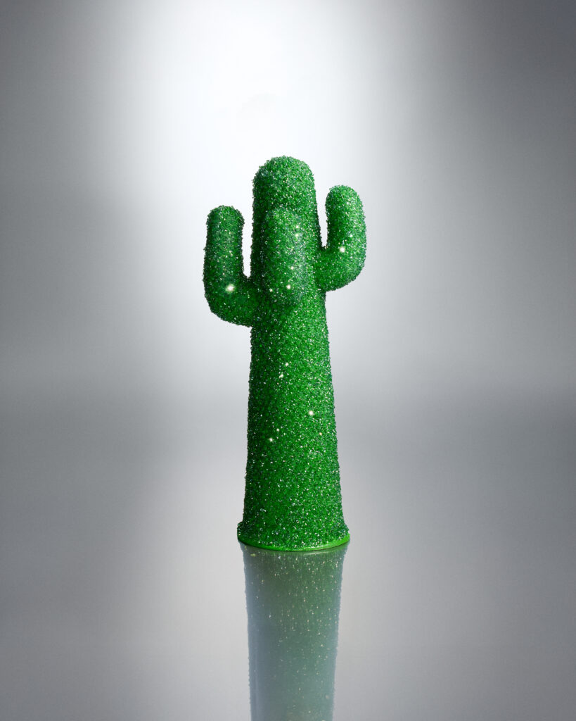 En el mundo del diseño y el arte, Gufram revisita su célebre Guframini CACTUS®, decorado a mano con cristales Erinite y elementos de cristal roca que evocan gotas de rocío sobre el desierto: una pieza de colección donde naturaleza y diseño se funden en equilibrio perfecto.