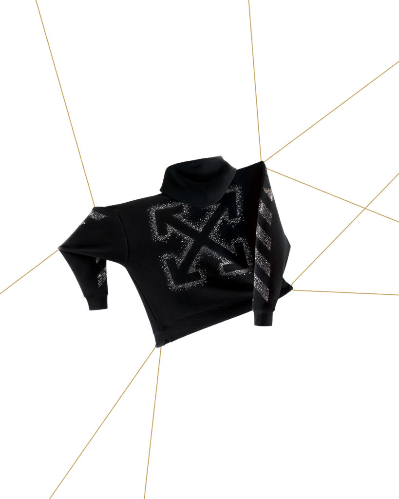 Por su parte, Off-White™ reimagina su emblemática sudadera con capucha, transformando el logotipo Arrow en un cielo de 4,025 cristales pavé, uniendo la cultura urbana con la elegancia artesanal del cristal.