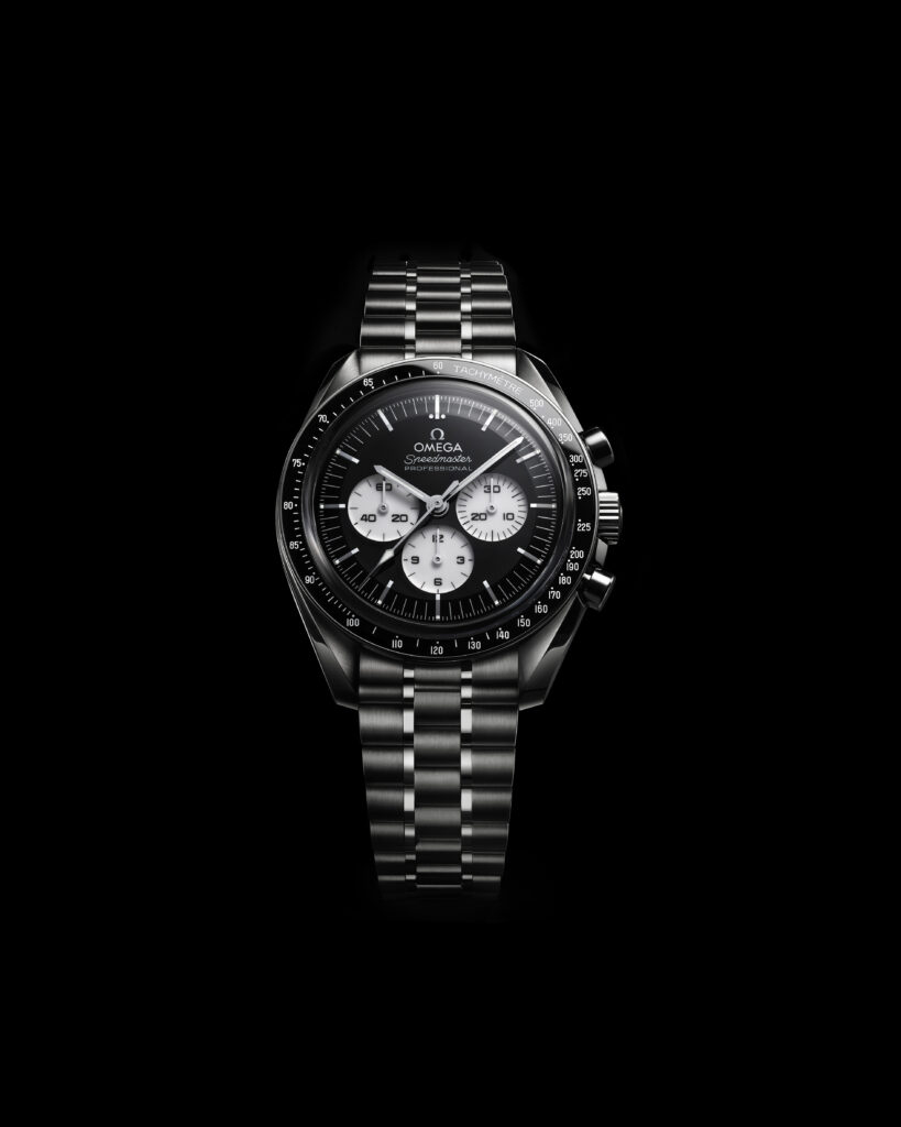 El bisel de cerámica negra con escala taquimétrica en esmalte blanco y el cristal de zafiro tipo “box” con tratamiento antirreflejos completan una composición donde la funcionalidad se encuentra con el diseño de alta precisión. Los brazaletes, fieles al estilo Moonwatch, combinan superficies pulidas y cepilladas, e integran el sistema de ajuste “comfort release” patentado por OMEGA para una experiencia superior en muñeca.