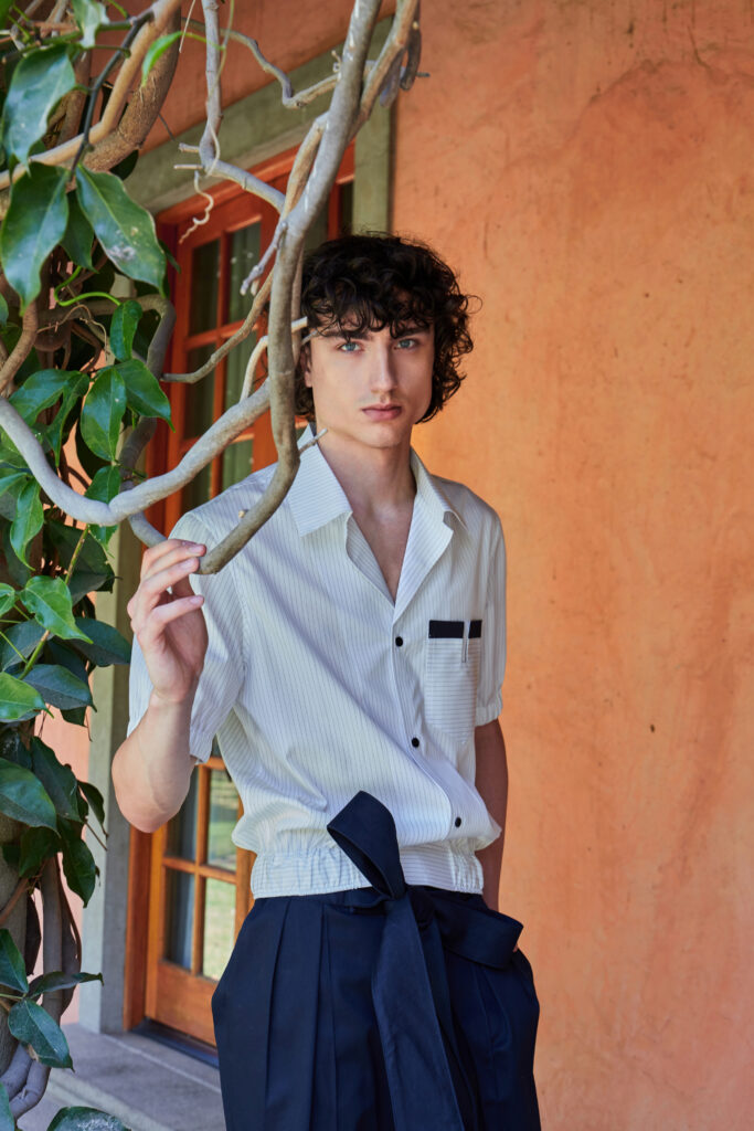 Confeccionada en textiles sustentables de España, Los Ángeles y Canadá (lino, viscosa, algodón, tencel), la línea se distingue por camisas con cuellos en V, escotes asimétricos que irrumpen con audacia, y detalles como elásticos, jaretas, botonaduras forradas y moños que evocan la exuberancia femenina de la posguerra.